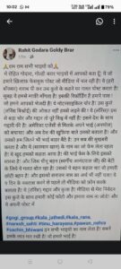 “ମୁଁ (ରୋହିତ_ଗୋଦାରା) (ଗୋଲଡି_ବ୍ରାର) ଭାଇମାନେ – ଆମେ ହିଁ ଆଜି ଆମେରିକାର କାଲିଫର୍ନିଆରେ (ହାଇୱେ 41, ଫ୍ରେସନୋ, ଆମେରିକାର ଏକଜିଟ୍ 127 ନିକଟରେ) (ହରି ବକ୍ସର) ଓରଫ (ହରିୟା) ଉପରେ ଗୁଳିଚାଳନା କରିଥିବା ବ୍ୟକ୍ତି। ତାଙ୍କର ଜଣେ ସହଯୋଗୀଙ୍କର ଘଟଣାସ୍ଥଳରେ ମୃତ୍ୟୁ ଘଟିଥିଲା! ଅନ୍ୟ ଜଣେ ଗୁଳିରେ ଆହତ ହୋଇ ହସ୍ପିଟାଲରେ ଭର୍ତ୍ତି ହୋଇଛନ୍ତି! ଏବଂ ଏହି (ହରି ବକ୍ସର) କାପୁରୁଷ କାର୍ ସିଟ୍ ତଳେ ଲୁଚି ରହିଥିଲେ!”, ପୋଷ୍ଟରେ ଲେଖାଯାଇଛି।
