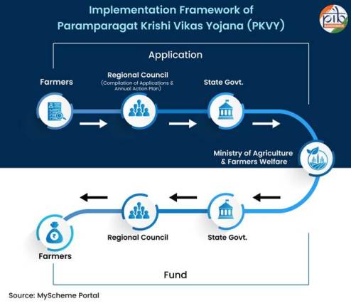 ବାର୍ଷିକ କାର୍ଯ୍ୟ ଯୋଜନା ଅନୁମୋଦିତ ହେବା ପରେ, କେନ୍ଦ୍ର ସରକାର ରାଜ୍ୟ ସରକାରଙ୍କୁ ପାଣ୍ଠି ପ୍ରଦାନ କରନ୍ତି, ଯାହା ପରେ ସେଗୁଡ଼ିକୁ ଆଞ୍ଚଳିକ ପରିଷଦଗୁଡ଼ିକୁ ପଠାଏ। ପରିଷଦଗୁଡ଼ିକ, ପ୍ରତ୍ୟକ୍ଷ ଲାଭ ହସ୍ତାନ୍ତର (ଡିବିଟି) ବ୍ୟବସ୍ଥା ମାଧ୍ୟମରେ ଚାଷୀମାନଙ୍କୁ ସିଧାସଳଖ ସହାୟତା ବଣ୍ଟନ କରନ୍ତି। ଏହା ନିଶ୍ଚିତ କରେ ଯେ ପିକେଭିଓ୍ବାଇ ଅଧୀନରେ ଆର୍ଥିକ ସହାୟତା ସ୍ୱଚ୍ଛ ଏବଂ ସମୟାନୁସାରେ ହିତାଧିକାରୀମାନଙ୍କ ପାଖରେ ପହଞ୍ଚିବ। ଏହି ସଂରଚିତ ଢାଞ୍ଚା ମାଧ୍ୟମରେ, ପିକେଭିଓ୍ବାଇ ନିଶ୍ଚିତ କରେ ଯେ ସମଗ୍ର ଭାରତରେ କ୍ଷୁଦ୍ର ଏବଂ ନାମମାତ୍ର ଚାଷୀମାନେ କାର୍ଯ୍ୟାନ୍ୱୟନର ପ୍ରତ୍ୟେକ ପର୍ଯ୍ୟାୟରେ ଦାୟିତ୍ୱ ବଜାୟ ରଖି ଜୈବିକ କୃଷି ସହାୟତା ପାଇଁ ସୁଗମ ପ୍ରବେଶ ପାଇବେ।